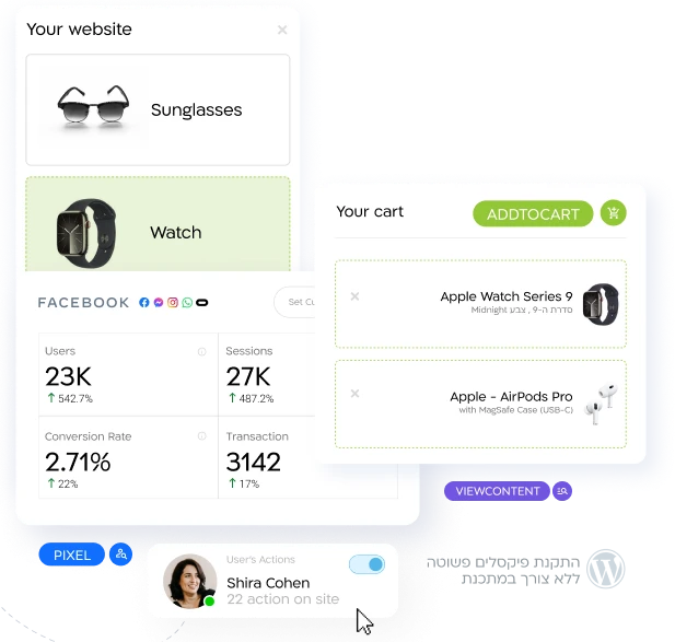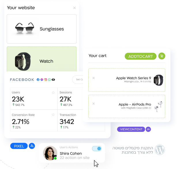 התוסף מאפשר שילוב מהיר של כלי מעקב ופרסום כמו Google Analytics, Google Ads, Google Tag Manager ופיקסלים של פייסבוק, בקלות וללא צורך בהתערבות מתכנת.